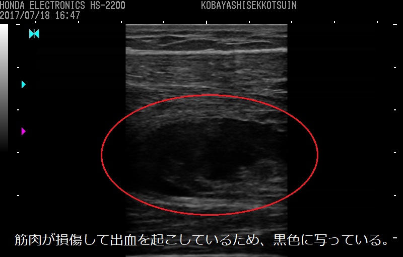 部分的に筋肉が断裂しており、一般的に肉離れといわれる状態です。