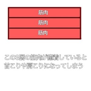 癒着してしまっている3層の筋肉を剥がしてあげて、それぞれの層で動けるようにしていくと循環が良くなり首こり肩こりが改善されるので、この層を押しつぶすようなマッサージをしてしまうと一時的に循環は良くなるので症状は改善しますが、根本の問題が改善していないためすぐに戻ってしまいます。